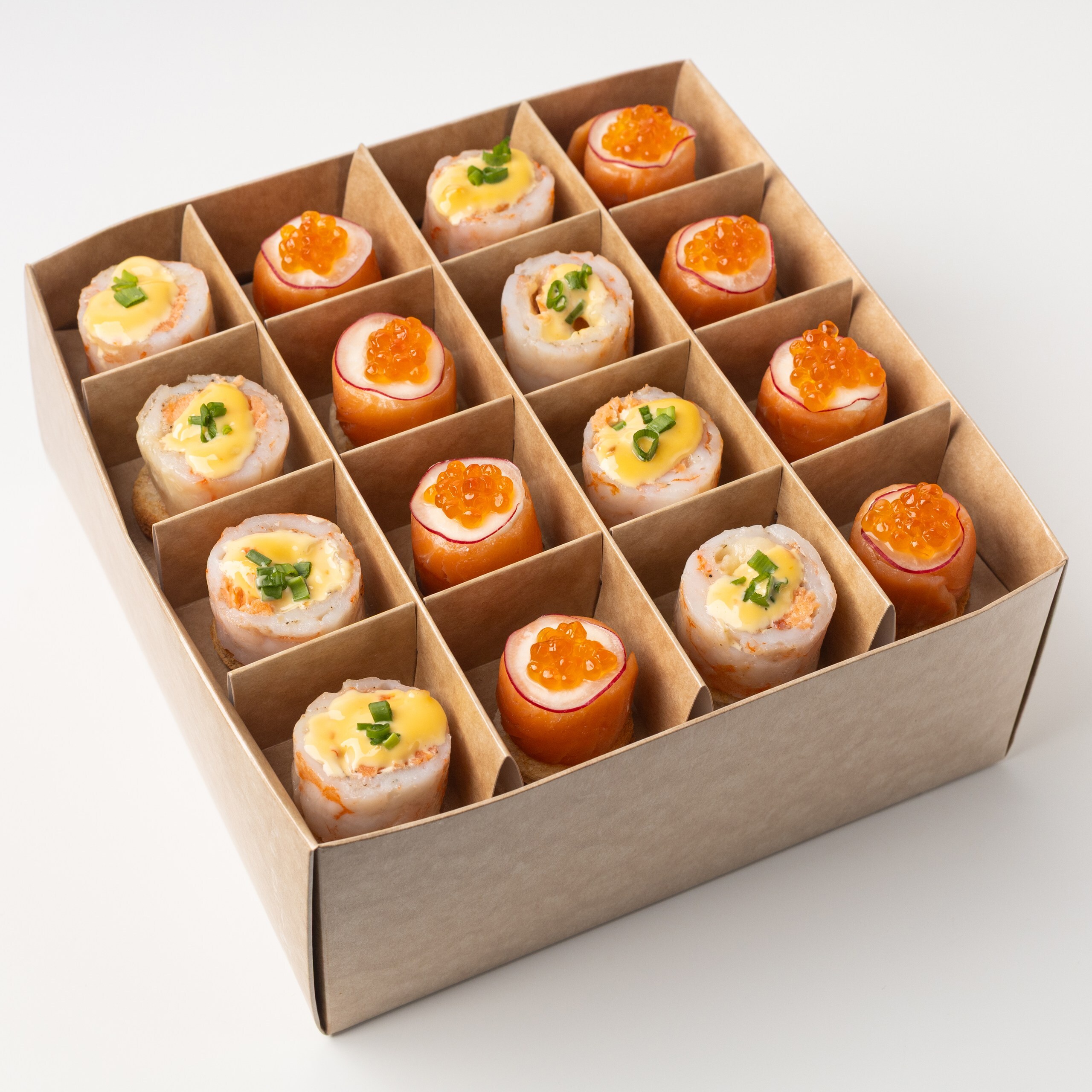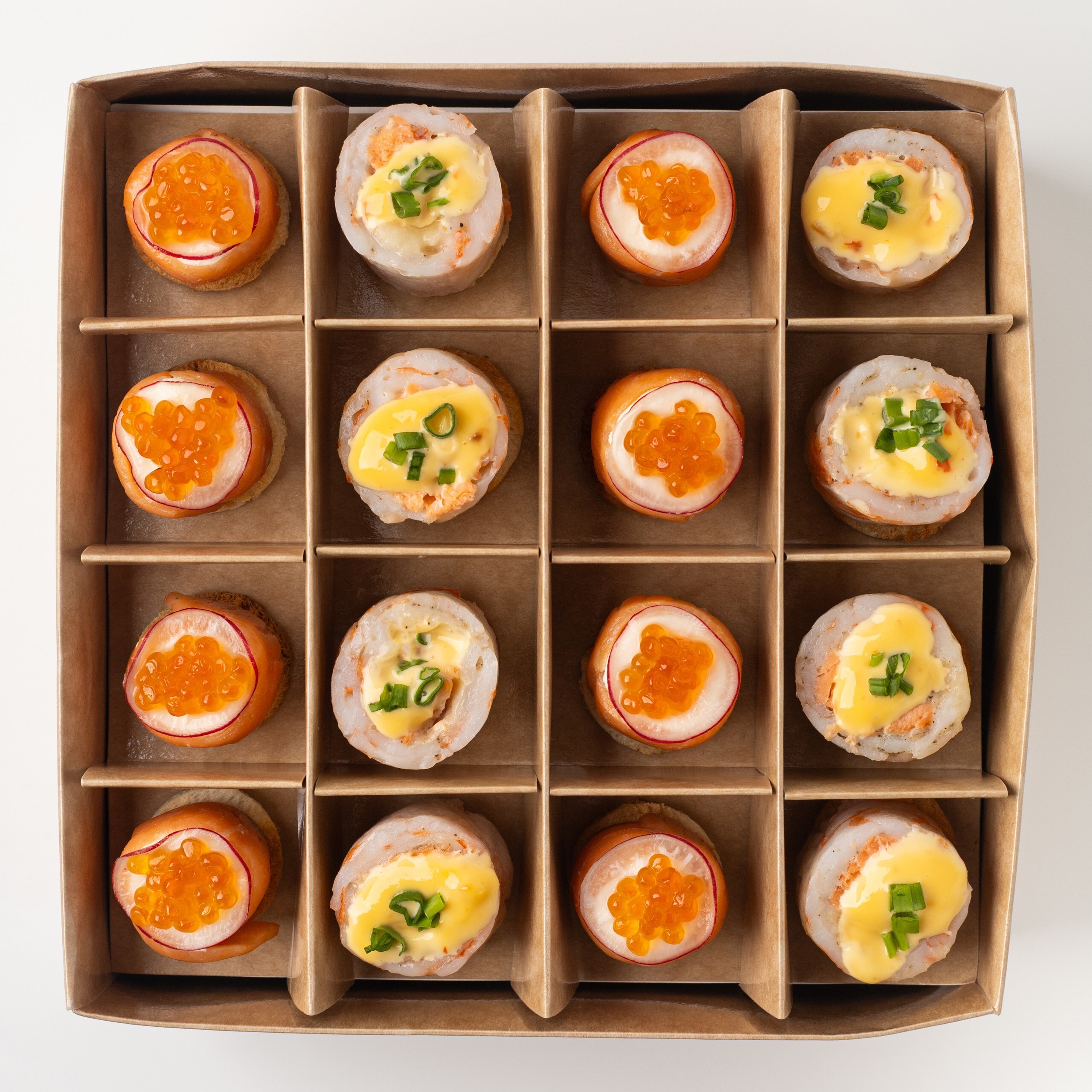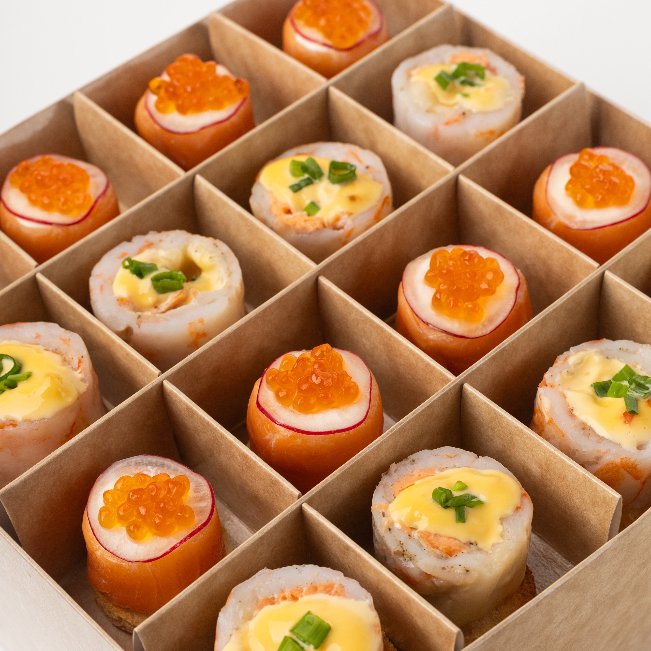 Бокс канапе с дальневосточным лососем и рулетиками из креветок с семгой