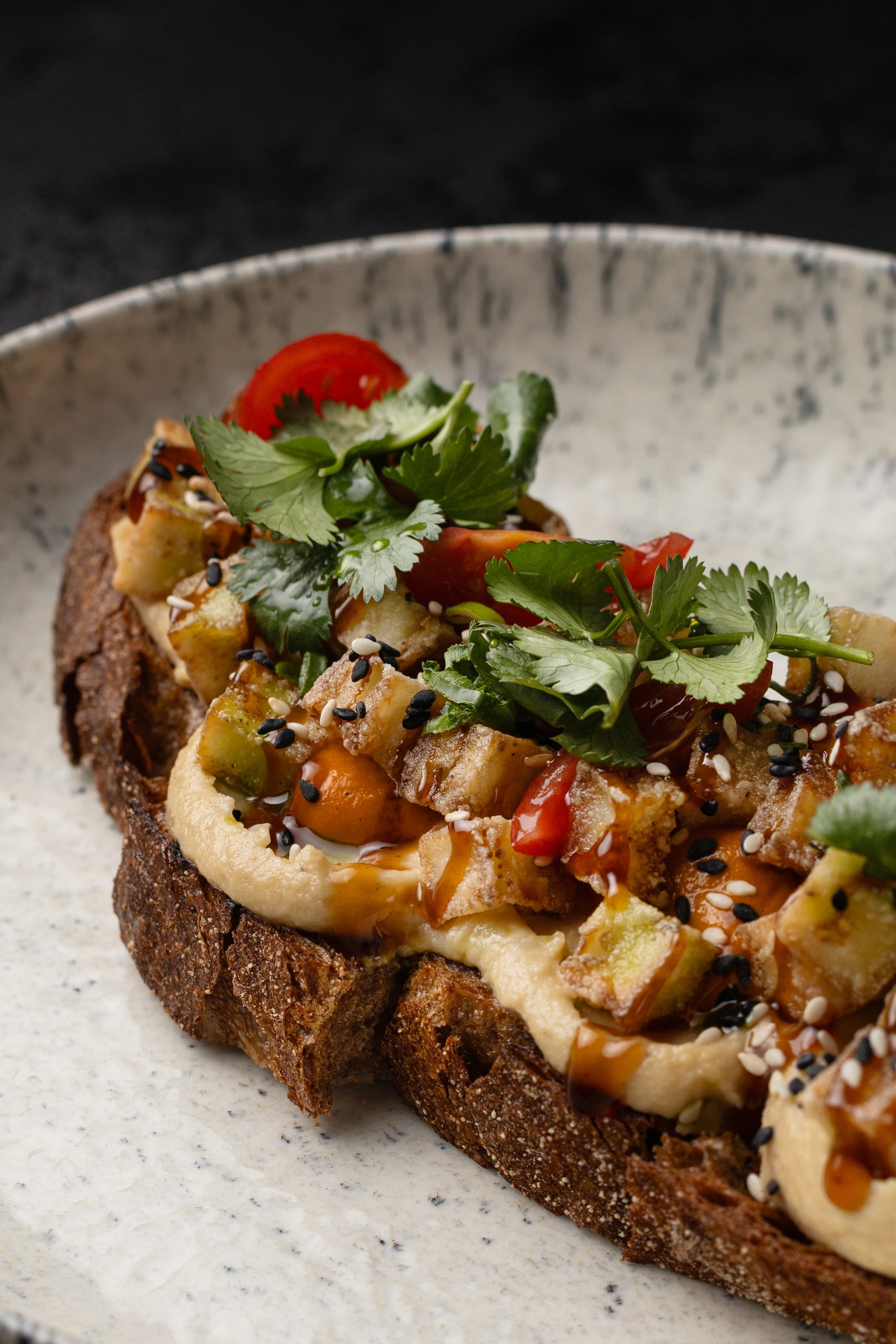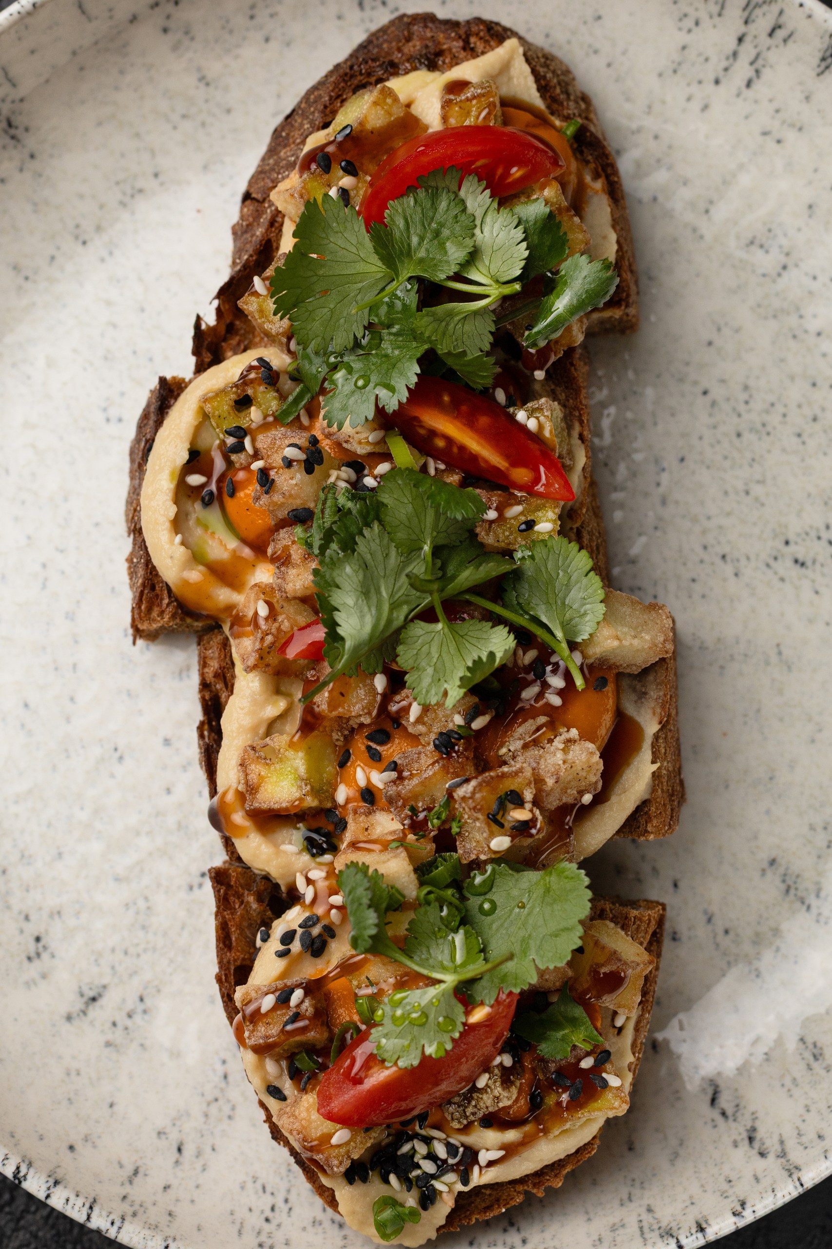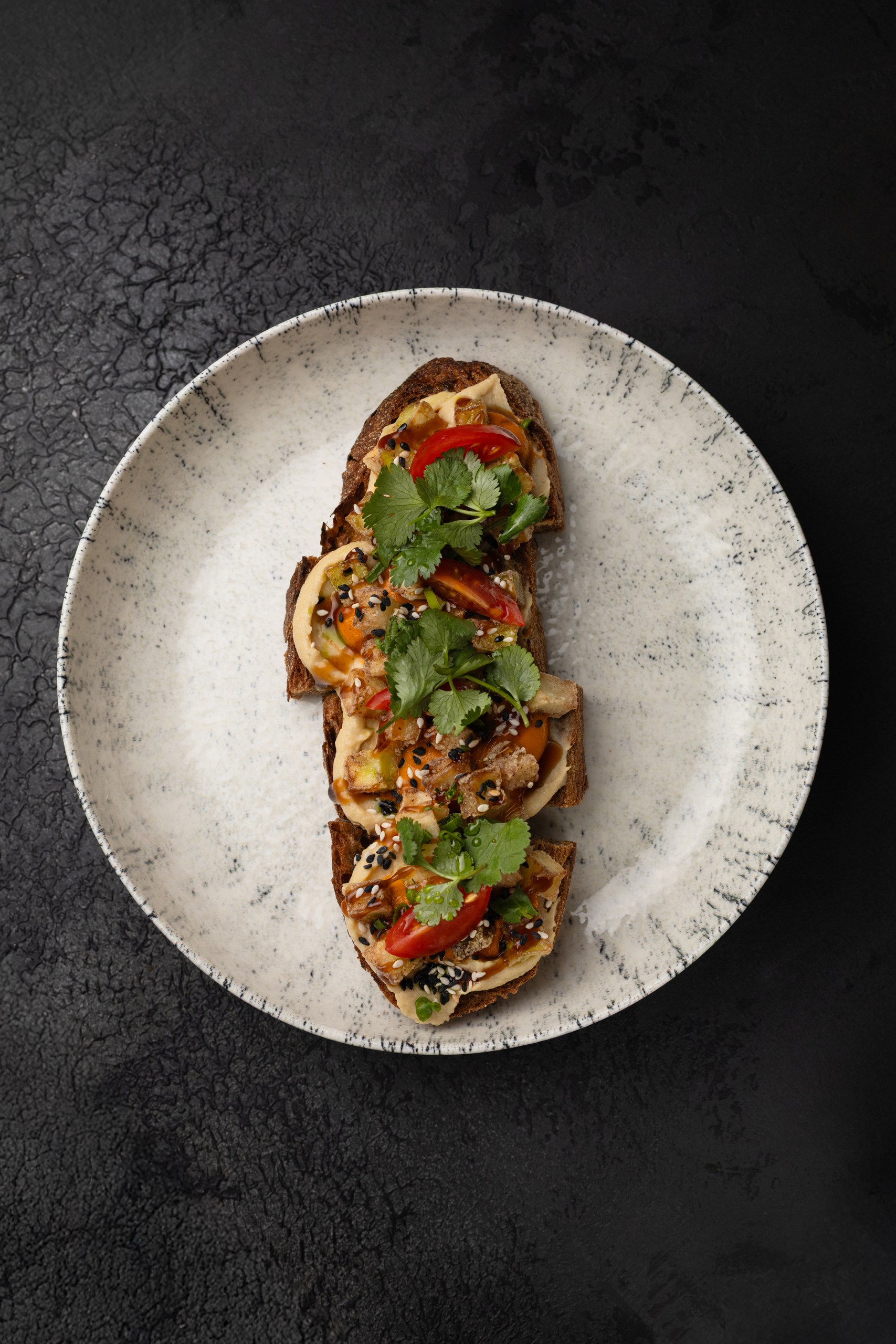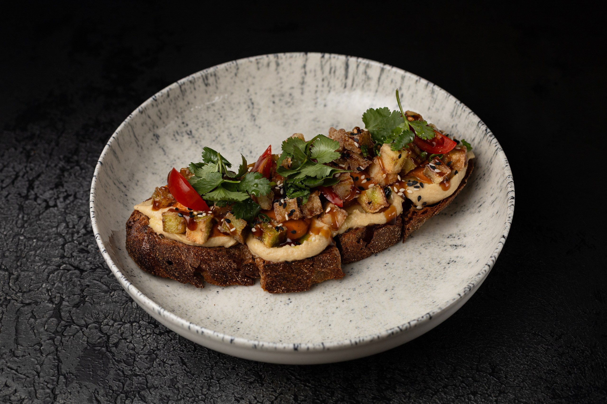 Ржаная чиабатта, хумус, баклажаны, томаты черри, соус терияки, нут, кунжут, микс салата, зелёное масло, кунжут