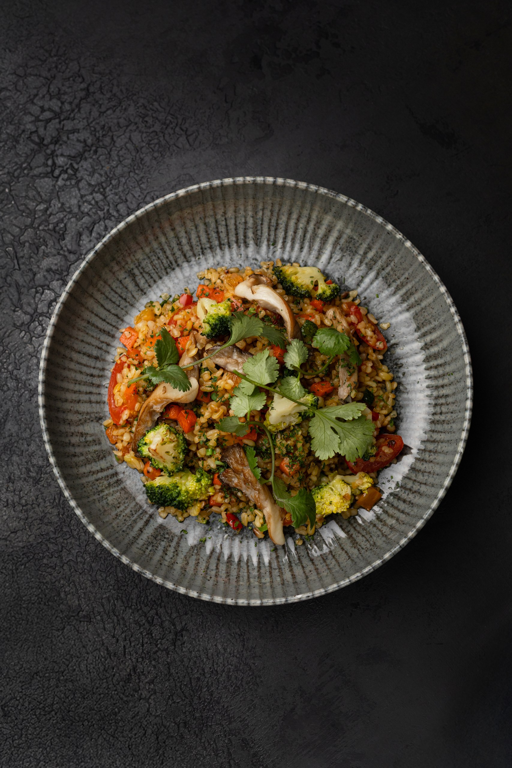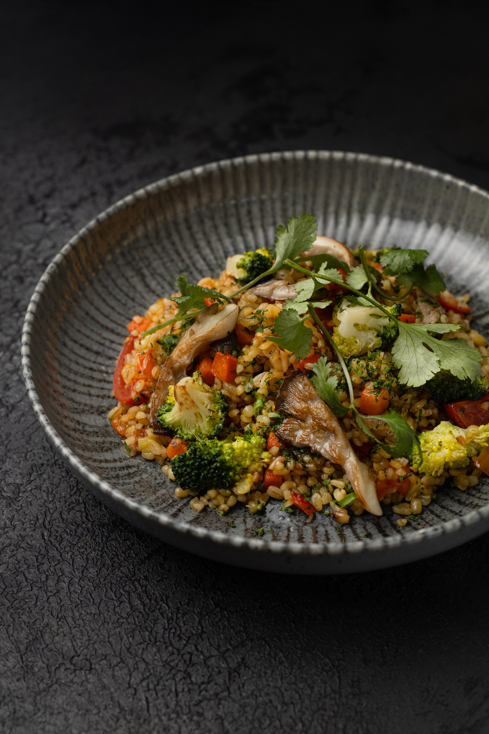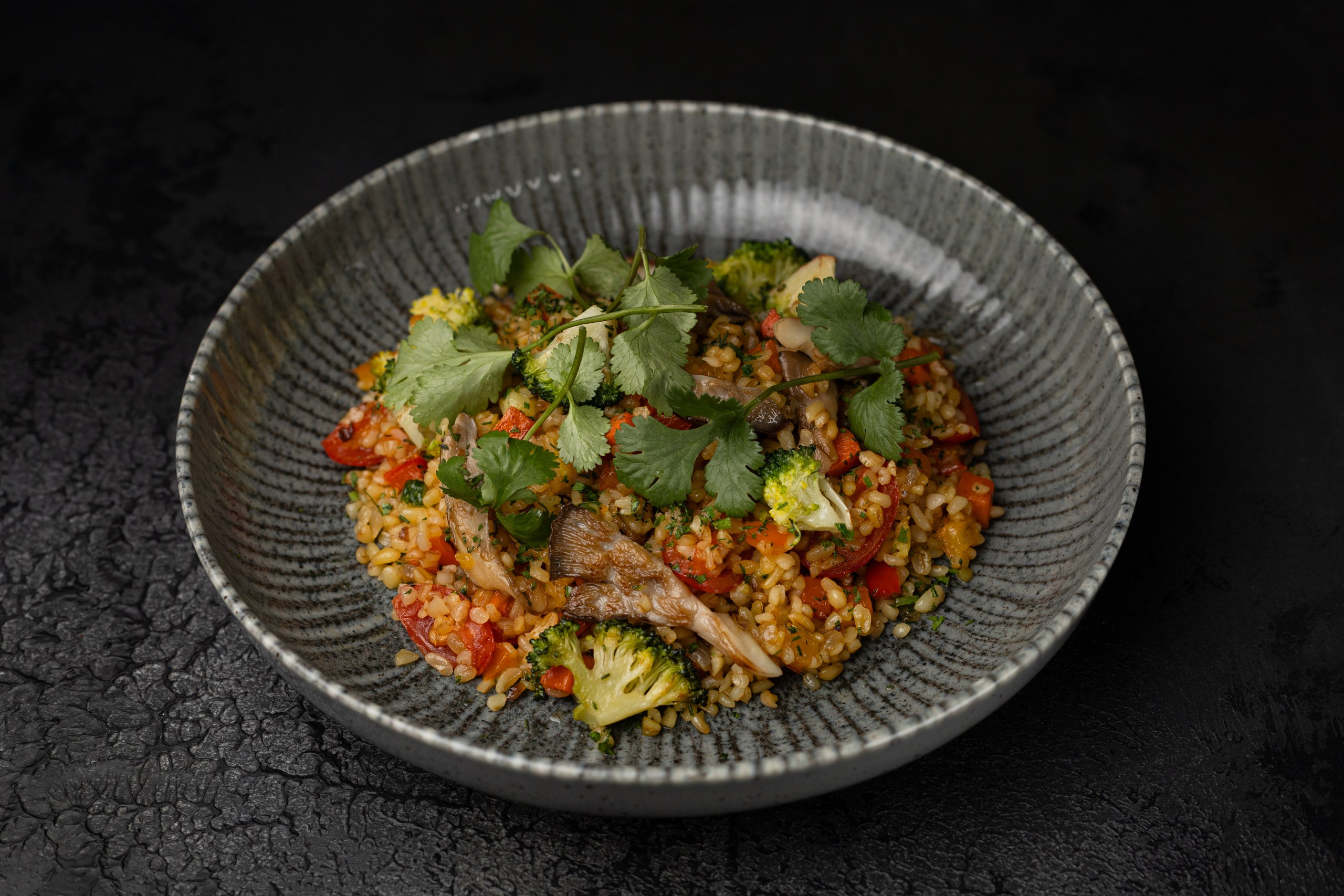 Булгур, морковь, кабачки, перец болгарский, брокколи, вешенки, томаты черри, зелень