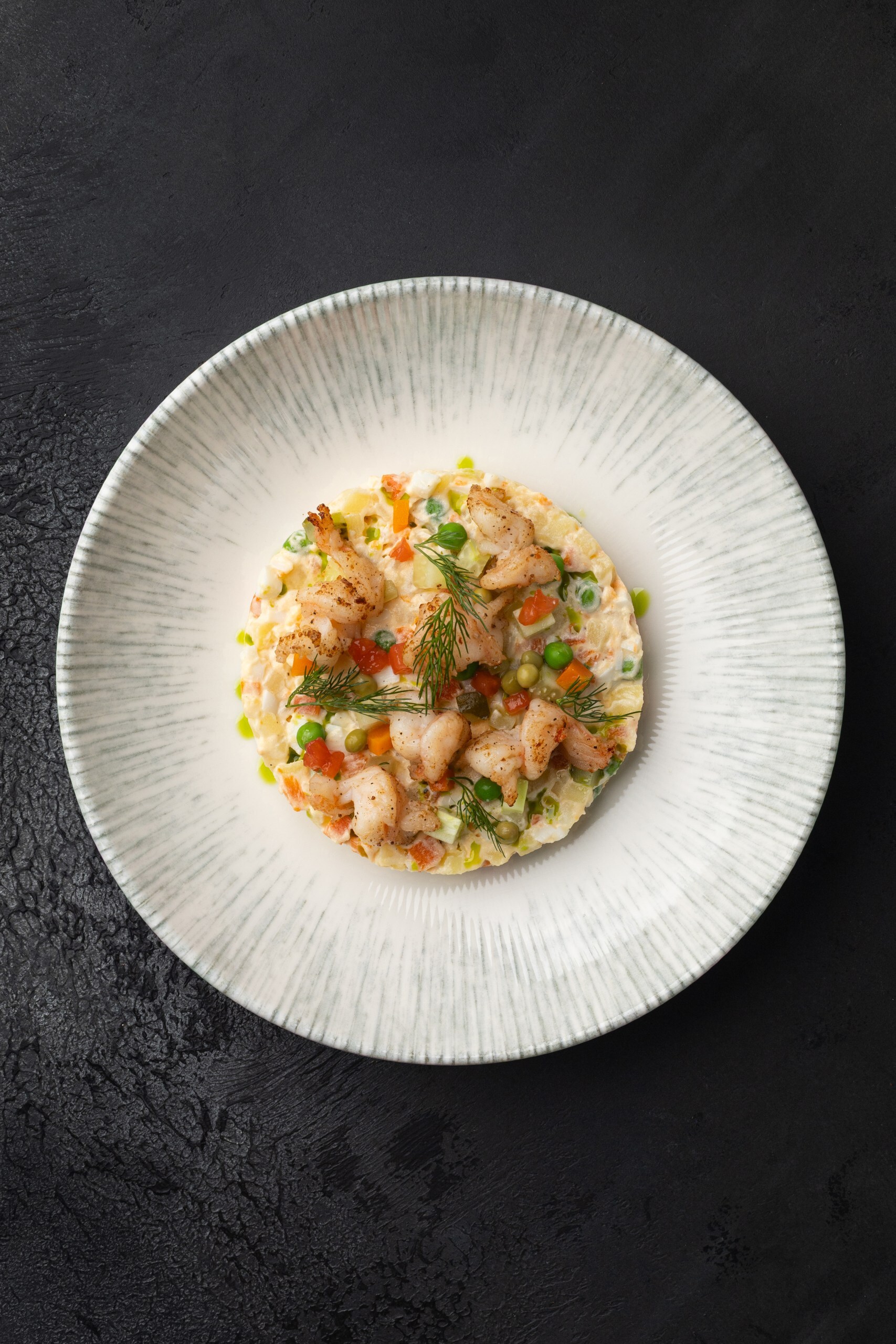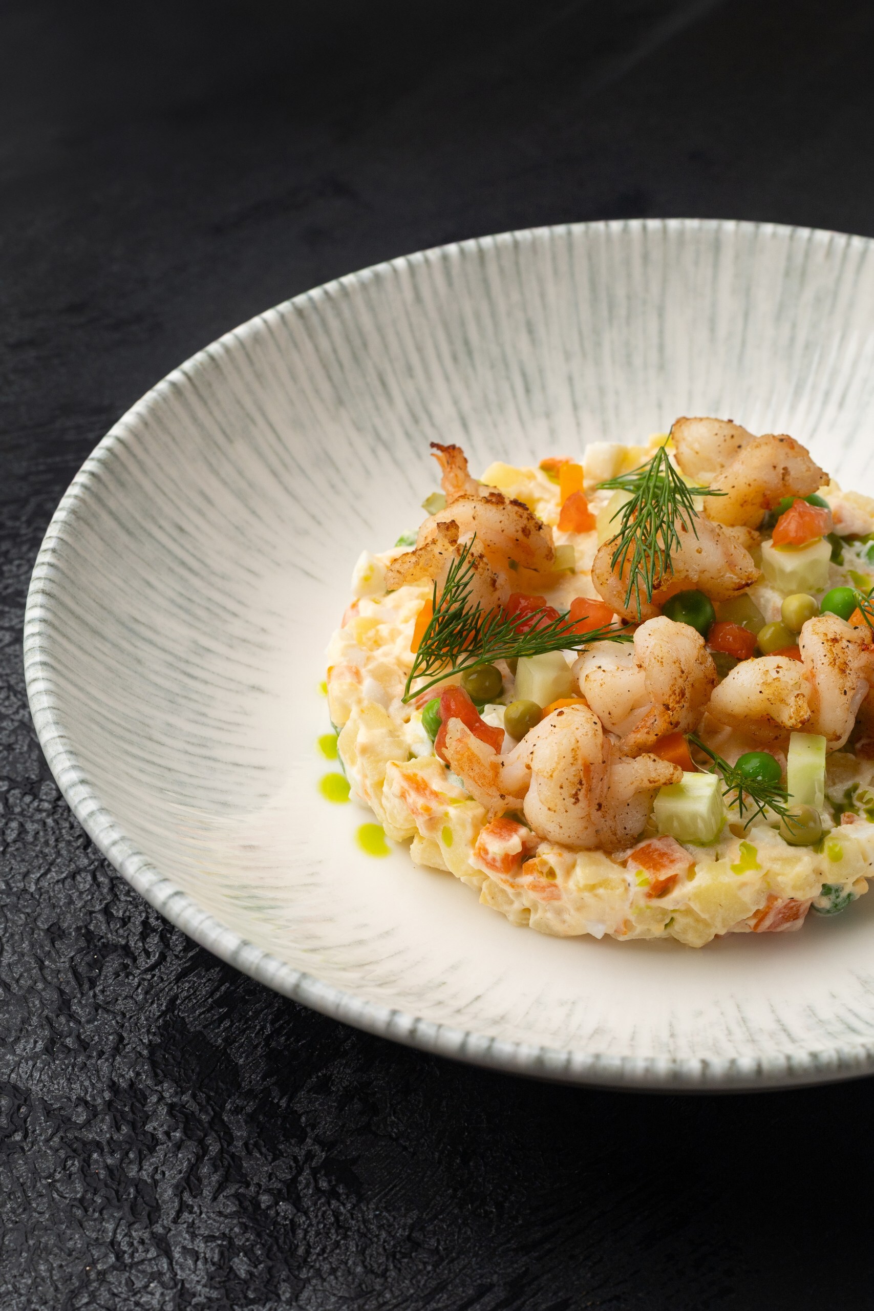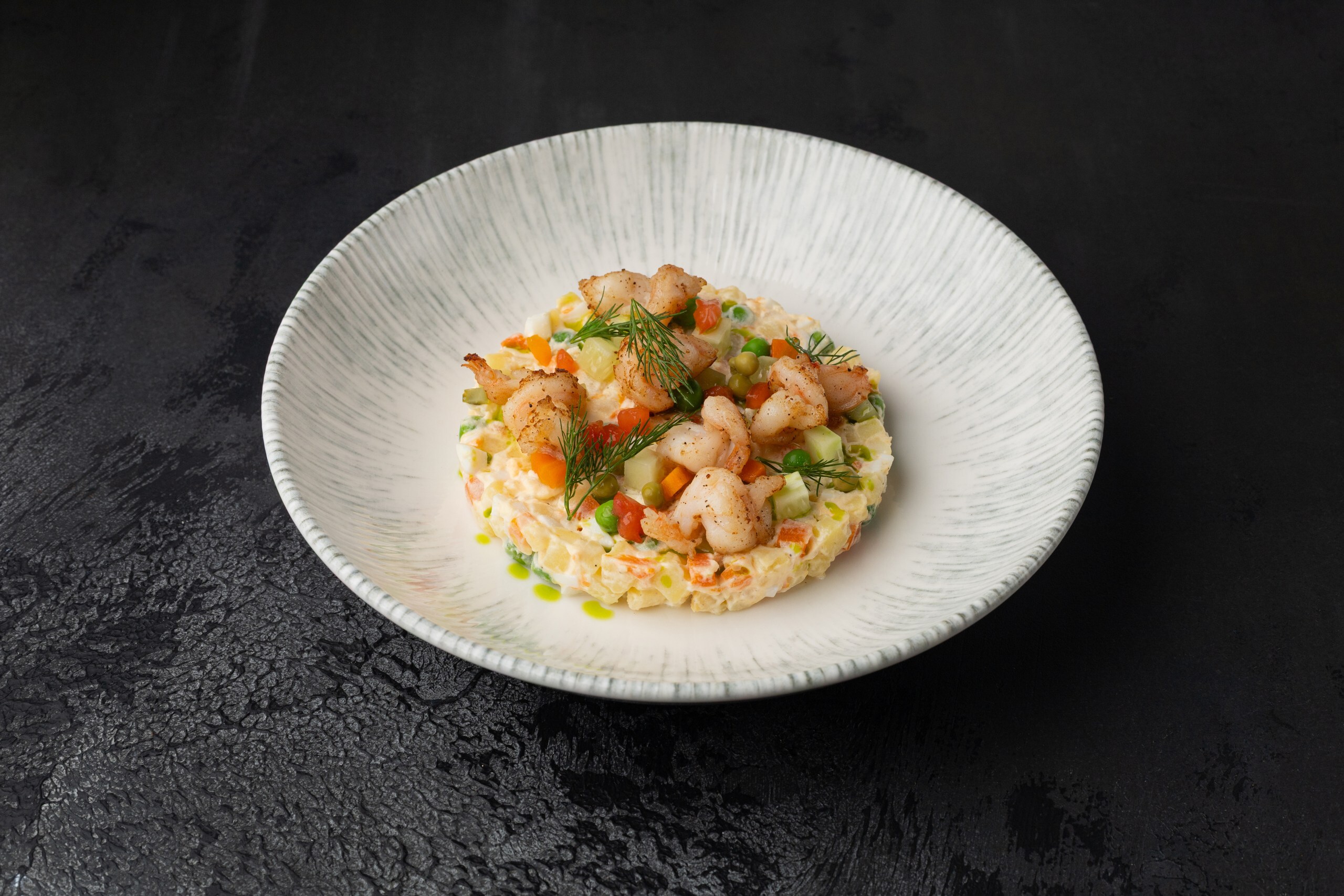 Креветки, огурец, картофель, морковь, яйцо, огурец маринованный, зеленый горошек, майонез, зелень