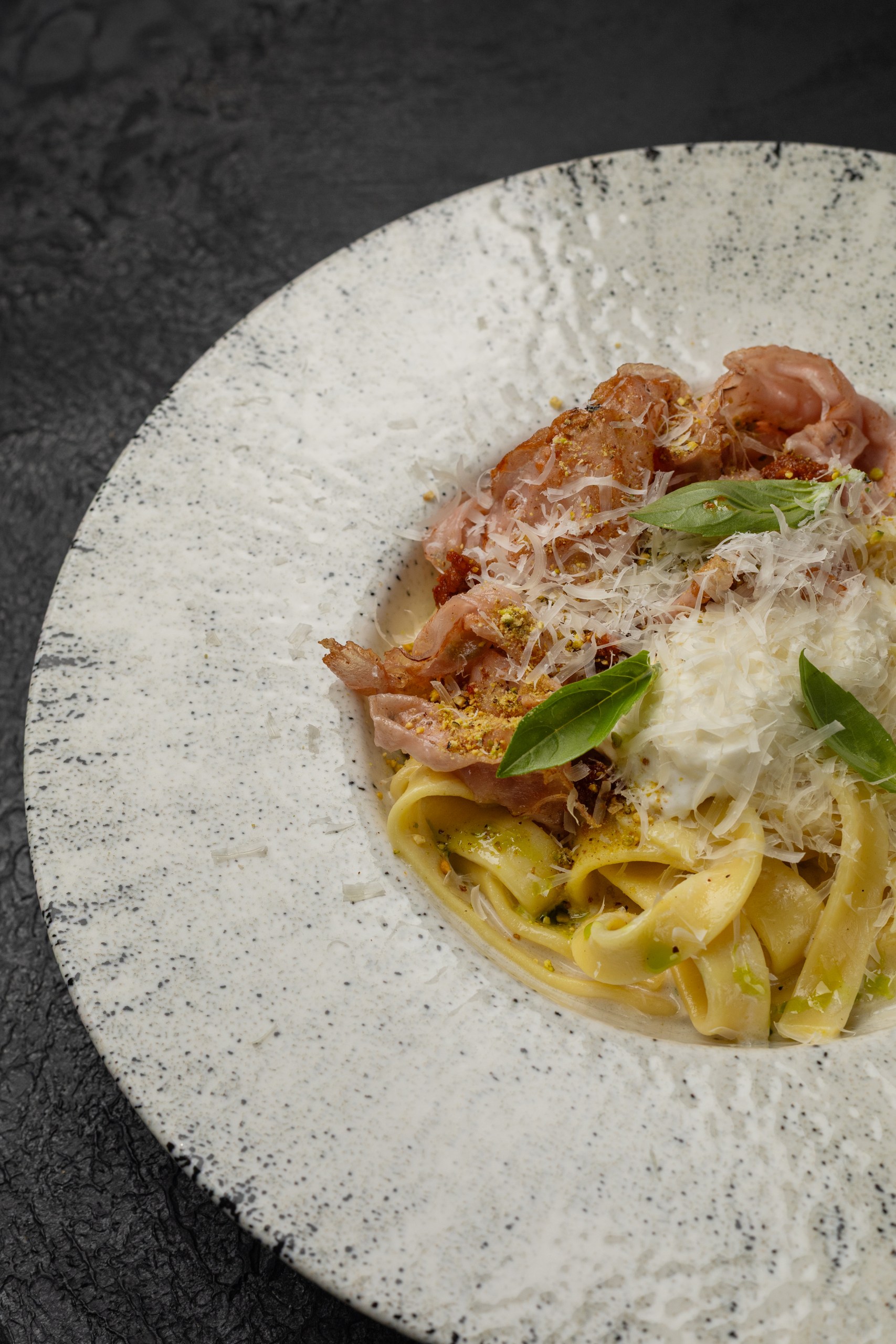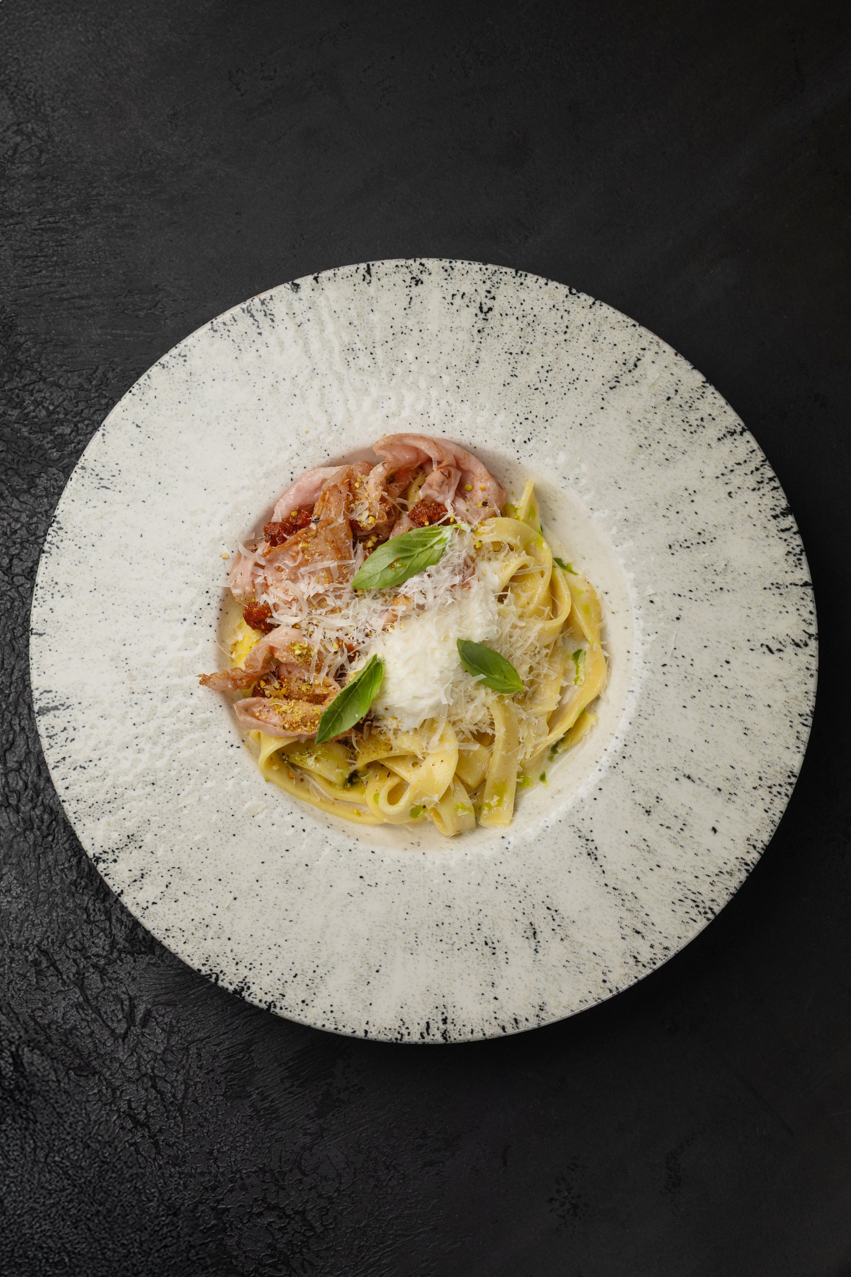Паста собственного приготовления, сливочный соус, итальянская ветчина, сыр Страчателла, соус из вяленых томатов, соус Песто, сыр Пармезан, базилик, фисташка