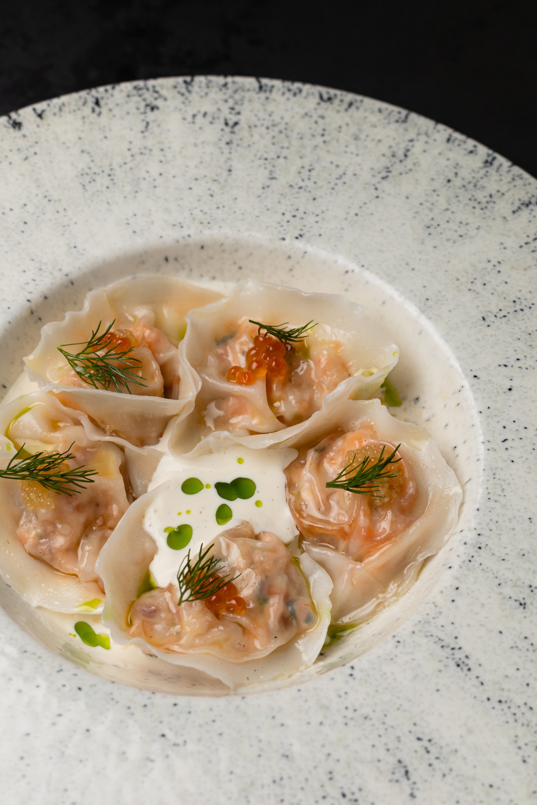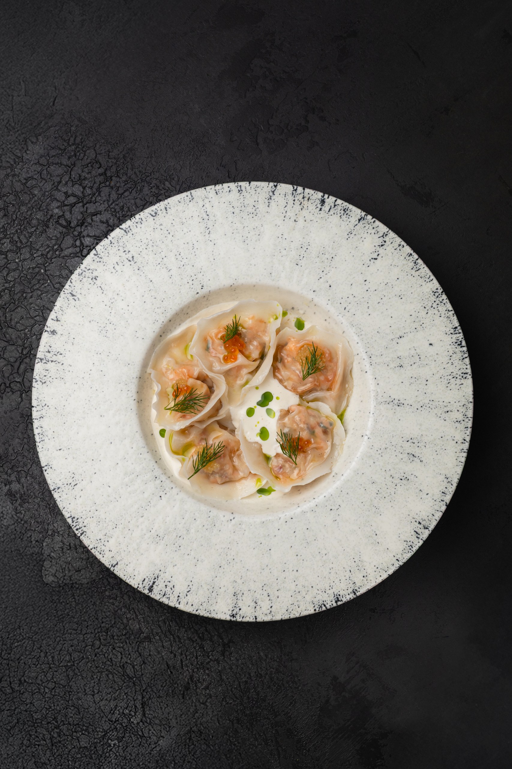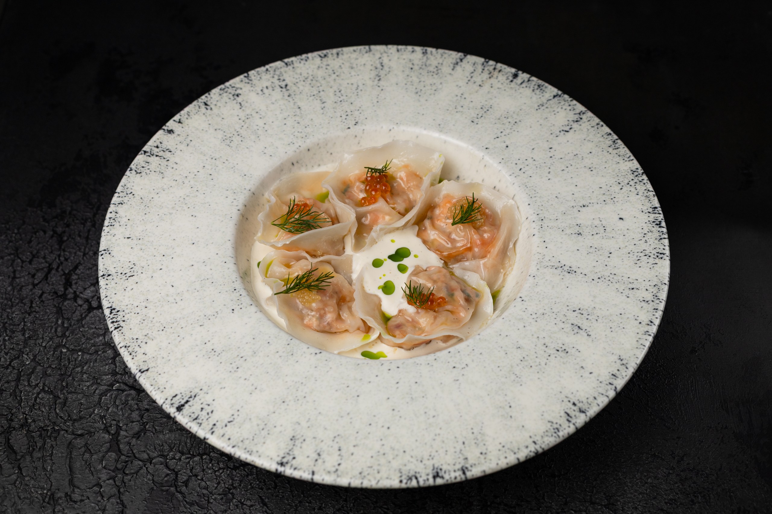 Равиоли с семгой и креветками в кокосом соусе Биск