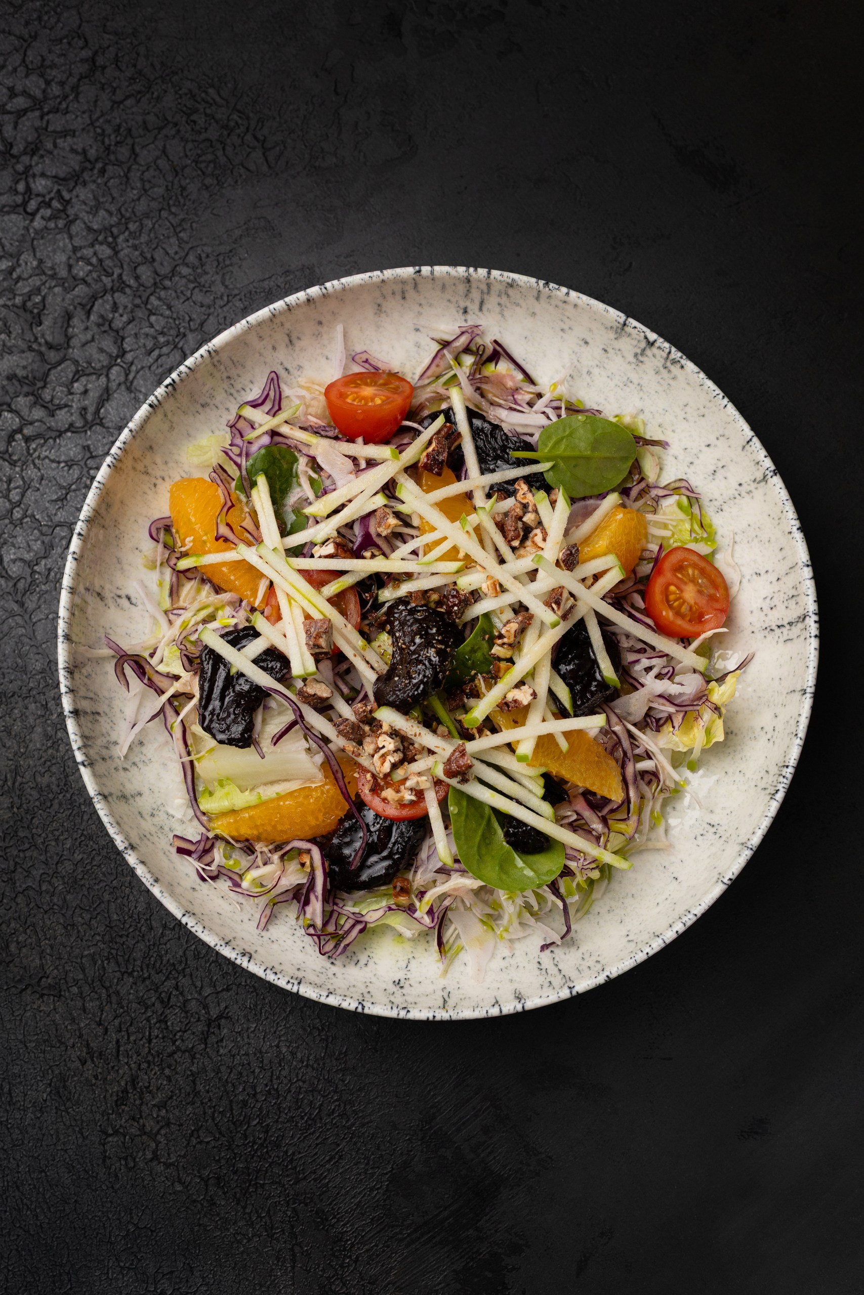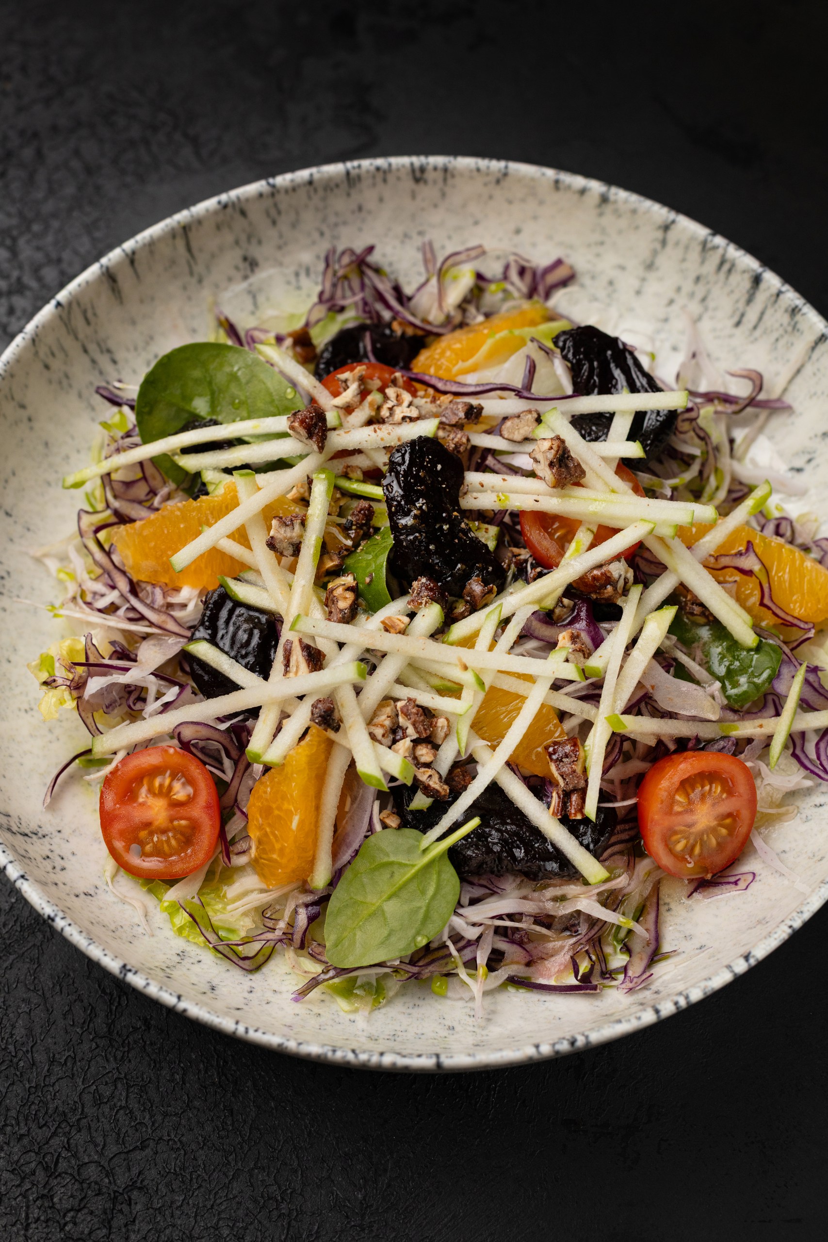 Микс салата, капуста, яблоко зелёное, апельсин, карамелизированный пекан, свёкла вяленая, томаты черри, заправка на основе мёда с алоэ, зелёное масло