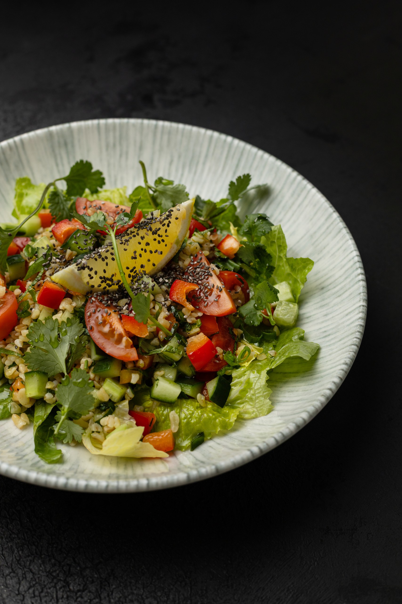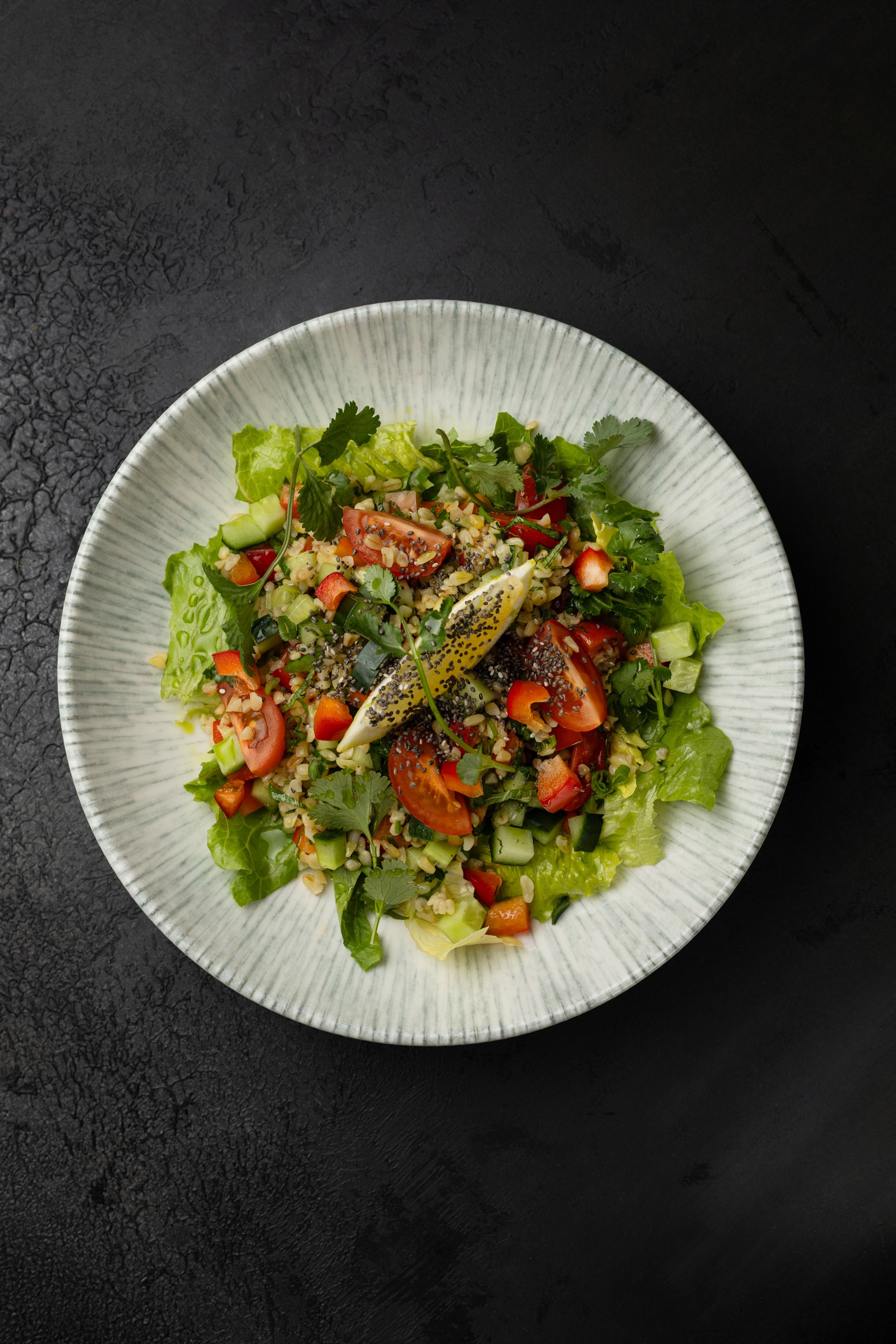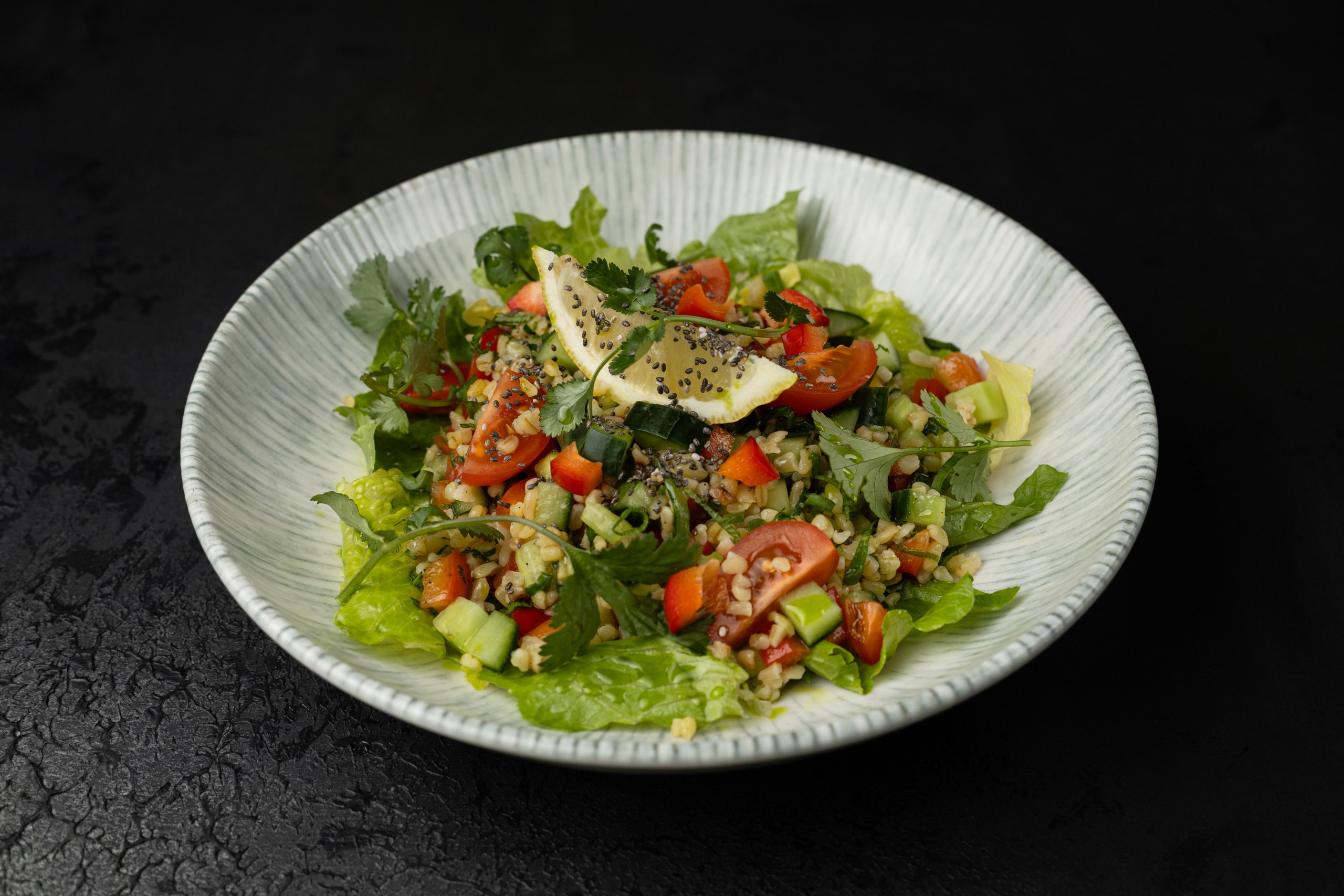 Микс салата, булгур, огурцы, перец болгарский, томаты, оливковое масло, сок лимона, мята, кинза, петрушка, зелёное масло