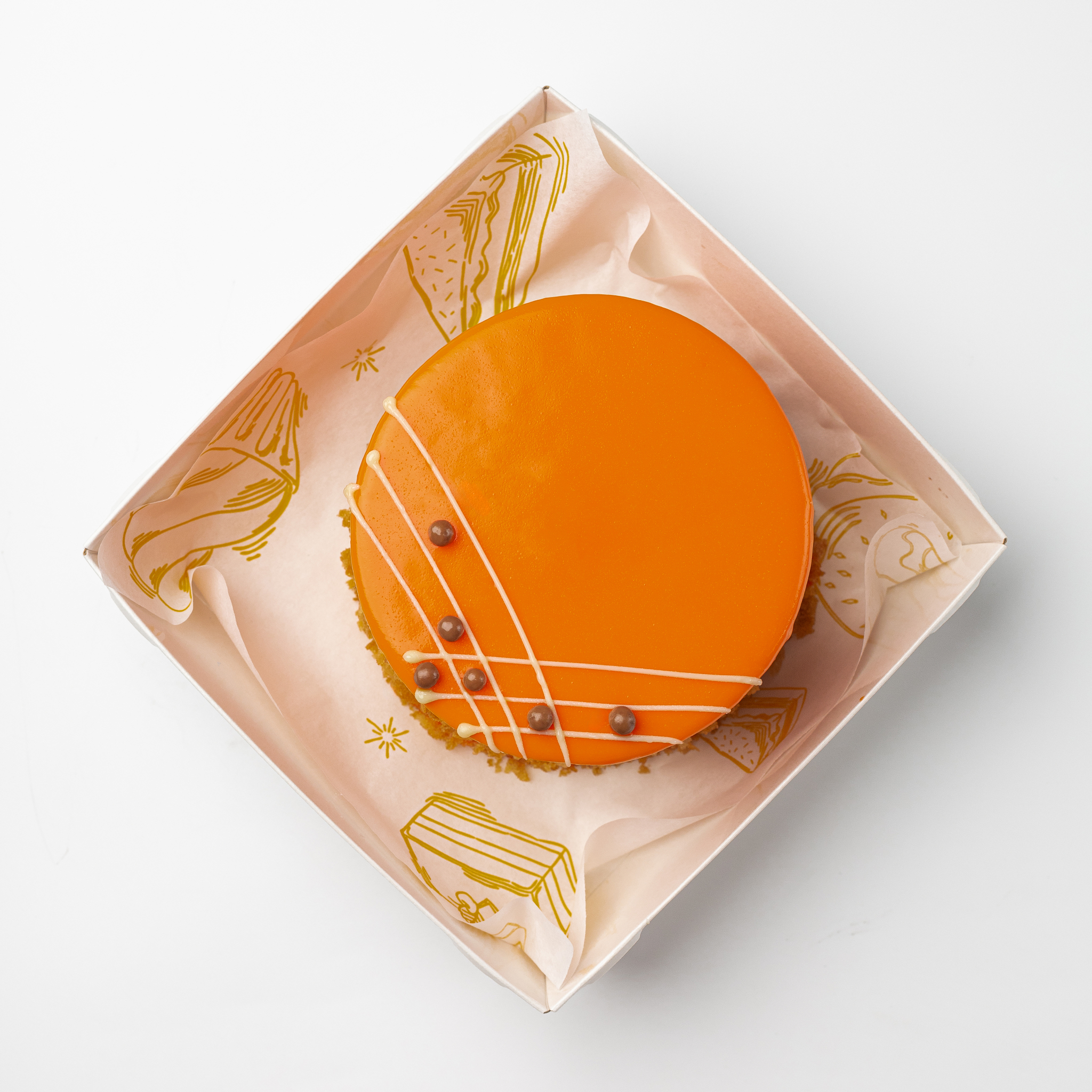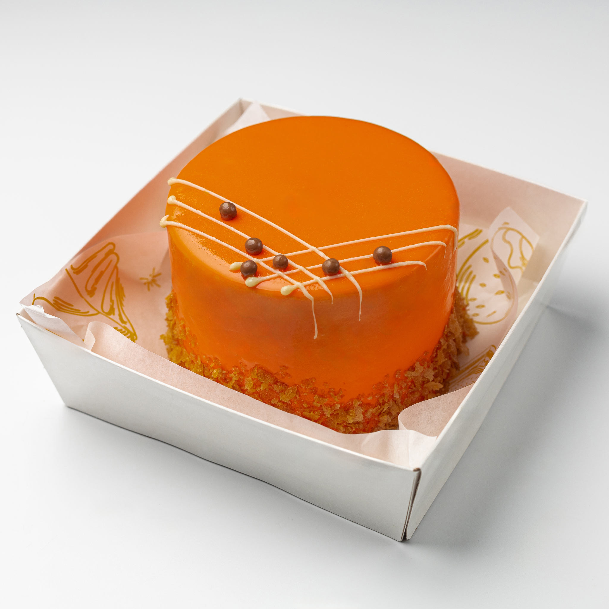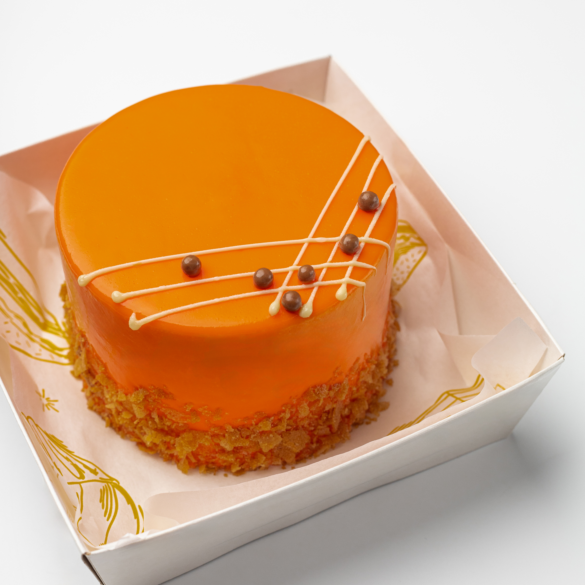 Нежный сырный мусс с пюре маракуйя, конфи из манго, хрустящий слой из песочного сабле, вафельной крошки и белого шоколада, покрытие из гляссажа на белом шоколаде