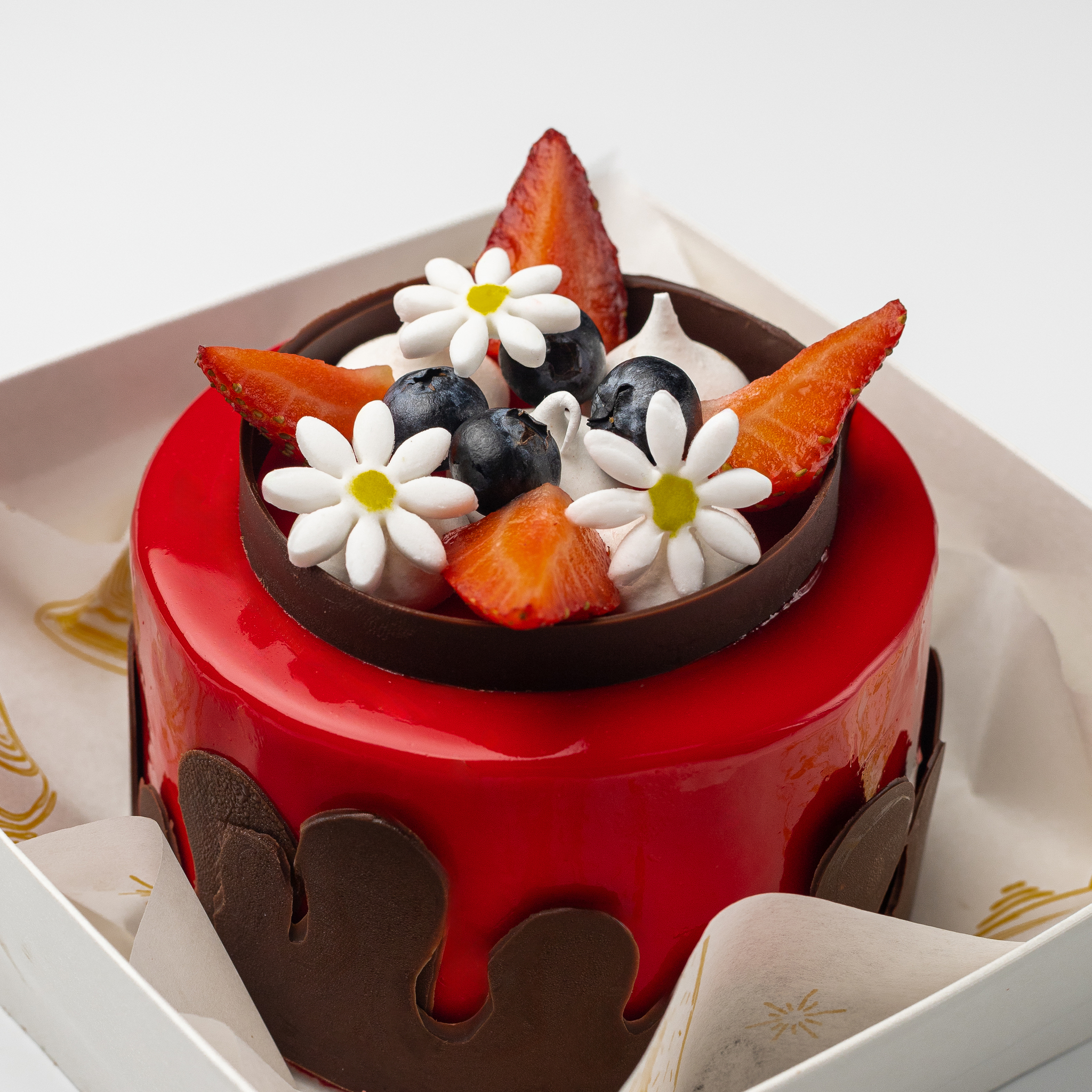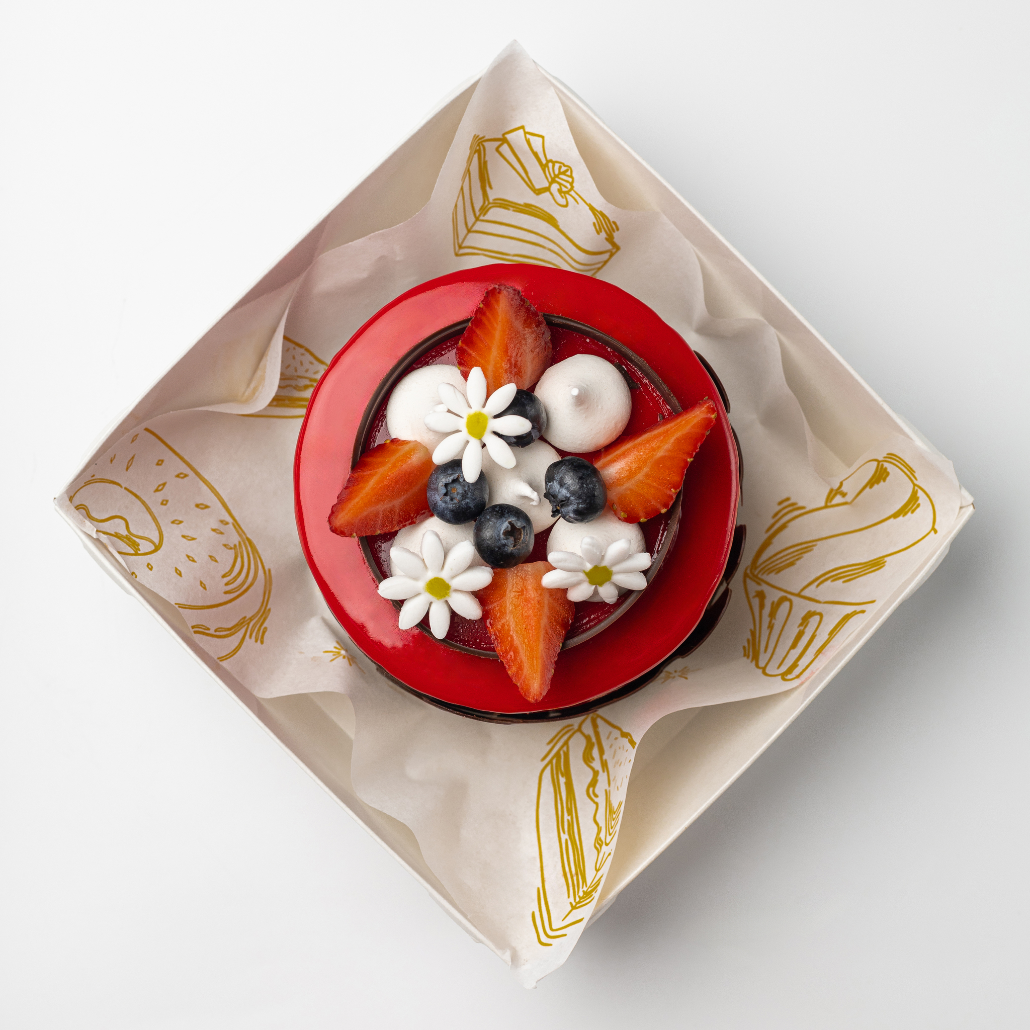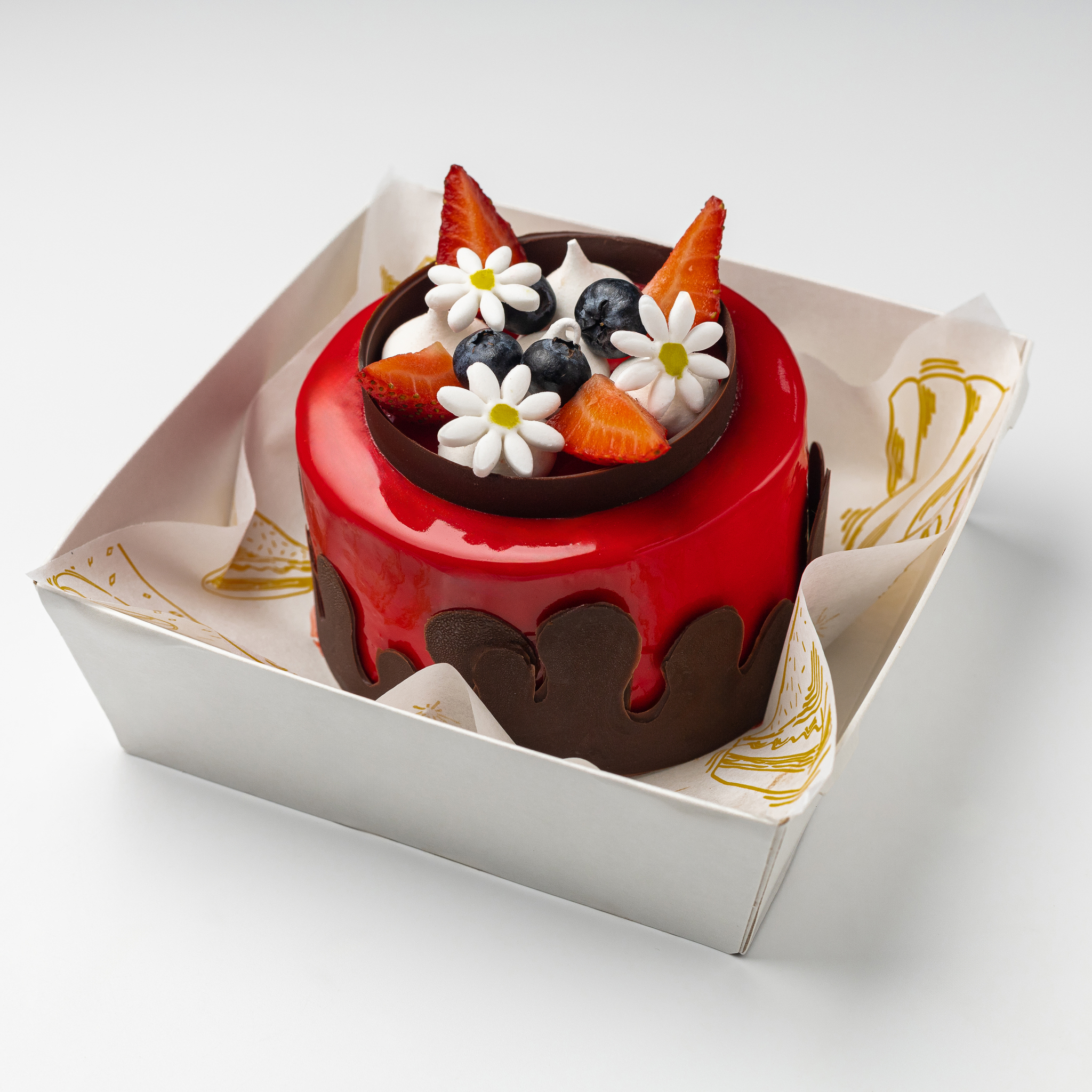 Мусс на белом шоколаде, вишневая начинка, миндальный бисквит